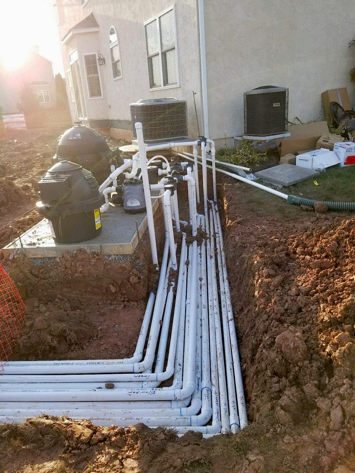 Right after the pool is dug all the plumbing is installed complete. We do not stub plumb any lines, all the plumbing is installed 100%. In doing this we can charge the plumbing system with air from a compressor to ensure there are no leaks. This test gets performed many times throughout the build process to ensure nothing has been broken during construction. We also install any electrical conduit in the same trench with the plumbing this way everything is together and decreases the chance of electrical conduit being damaged later.