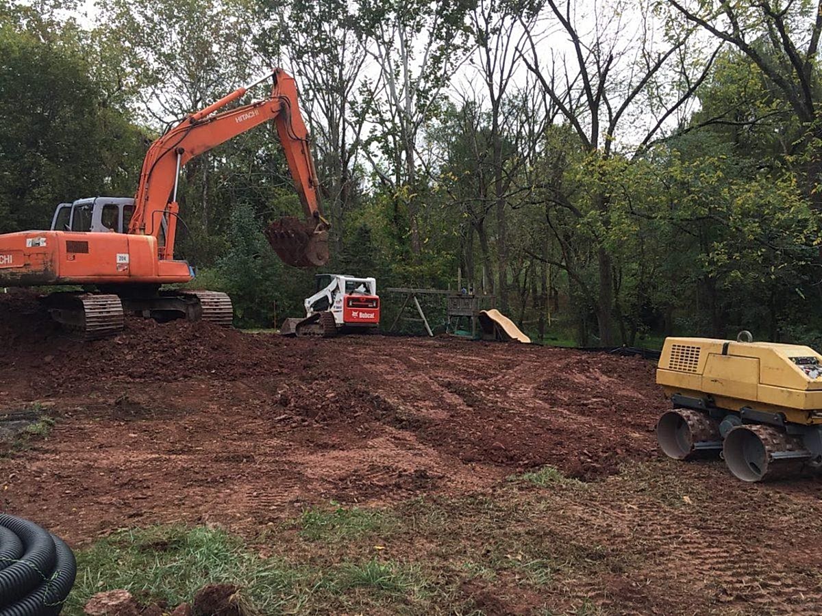 Now that the deck has been poured we are ready to respreads the topsoil that we stripped and stockpiled at the beginning of the job. Many companies will charge a machine hourly rate to re-spread this dirt, we include this at no additional charge. We do offer an additional service we refer to as rake and seed. We bring in a machine with a rake as well as men with hand rakes to fine tune the topsoil and get rid of rocks and branches. We then spread seed so you can grow grass just like before we started the project. Ask us about rake and sod to skip the time to wait for seed to grow, sod is instant grass!!