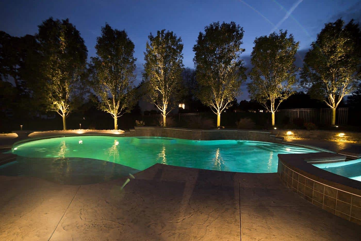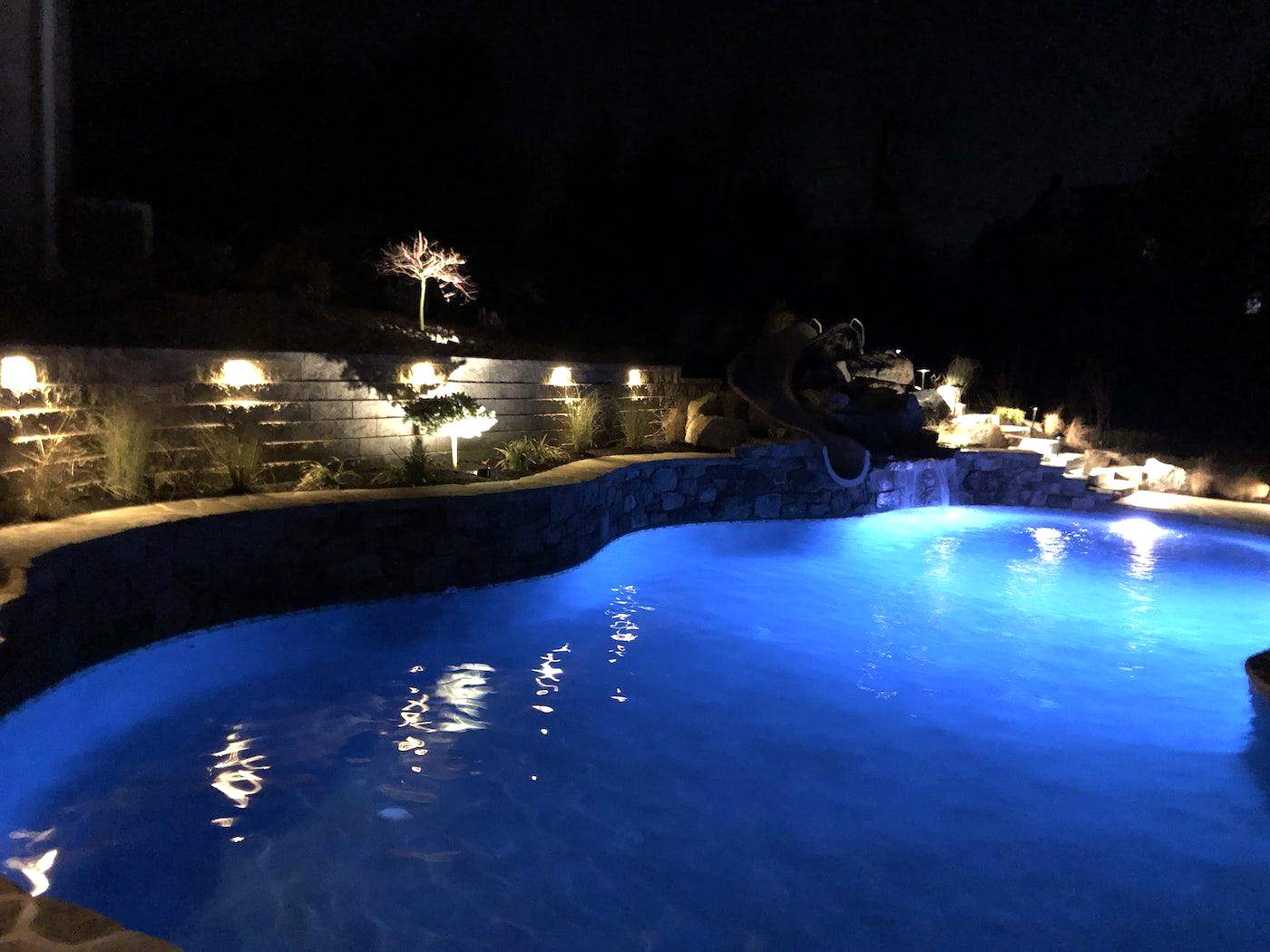 We are a full-service Landscape Lighting Pool company with the ability to design, install and maintain a custom landscape light package for your house and pool. As well as adding security and safety to unlit areas, the Pool Lighting services adds that soft glow to really showcase anything you want to light up during the night. Our systems can also be operated wirelessly via Bluetooth from any smart device and can be set a variety of ways!